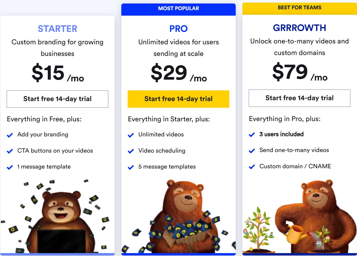 Entrepreneurs and startups can use Bonjoro video messaging for free up to 50 videos. After that point you can get one of their paid plans to unlock custom branding and more included videos - here's the pricing: