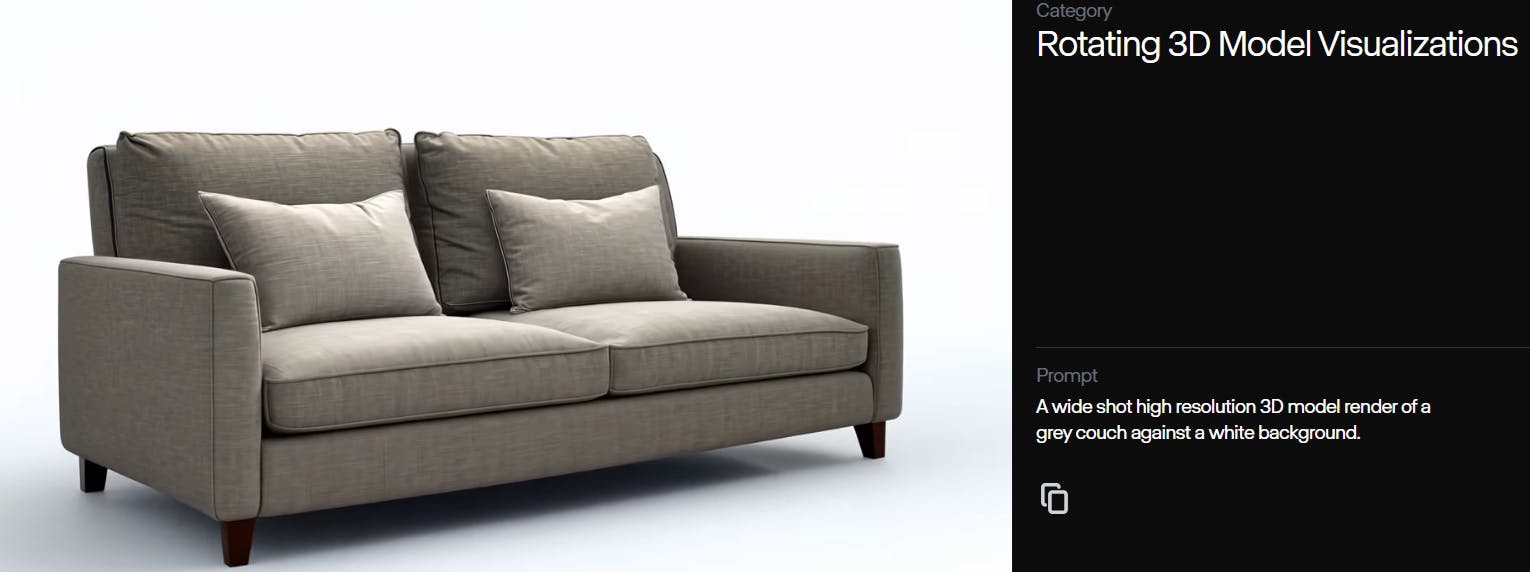 One practical application of Runway's text-to-video feature is product showcases. You can generate videos highlighting your product's key features or benefits to set clear expectations for your customers. Here's a sample prompt for a 3D model of a grey couch.