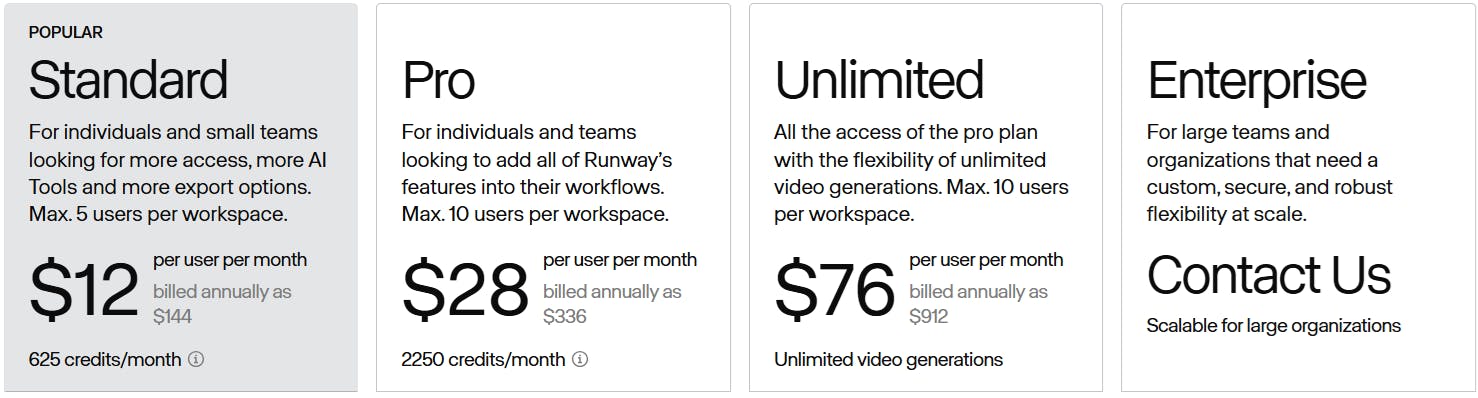 You can get started with Runway's free AI video generator. It gives you 125 one-time credits, which is ideal for familiarizing yourself with their AI-powered tools and content creation features. If you want to access more, you can choose any of the pricing plans.
