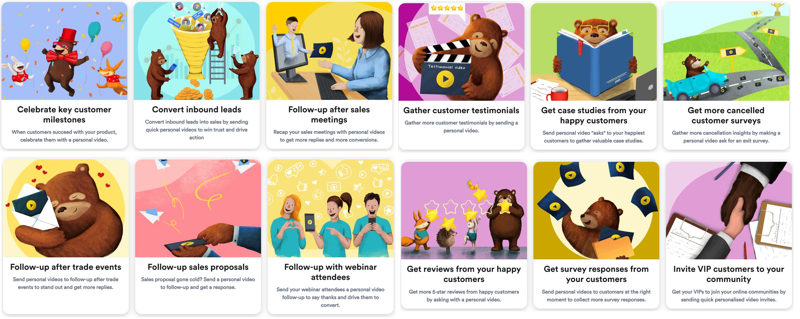 Each funnel includes a sample subject line, message template, and call-to-actions. It will also guide you to pinpoint when to send your videos. You can also build custom video templates to save time and ensure consistency.
