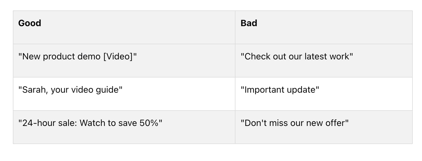 - Add "video": Boost open rates by 19%. It tells people there's something to watch. Example: "New product demo [Video]"